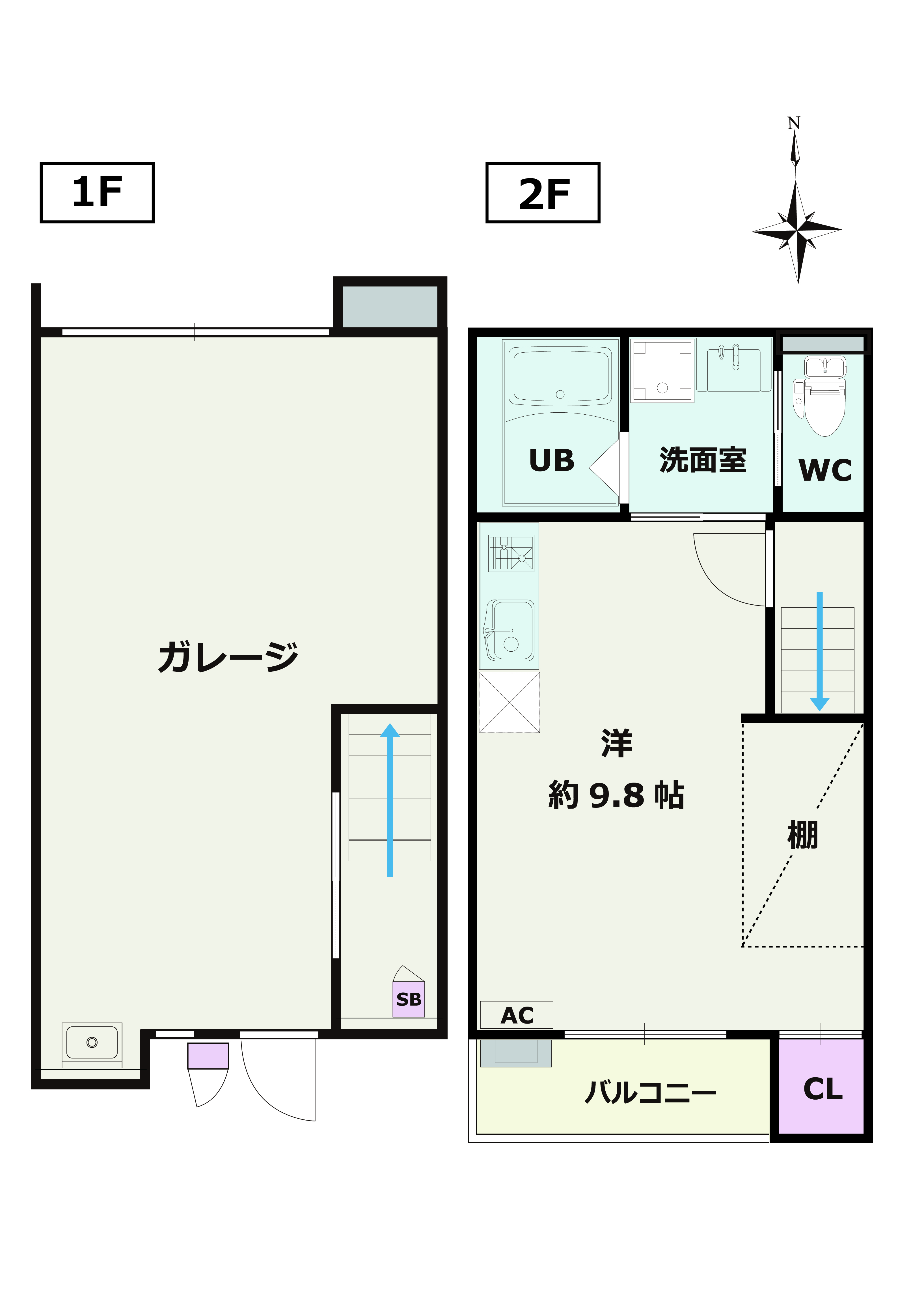| 広さ | 洋室 9.8帖(ガレージ含めた専有面積57.15㎡) |