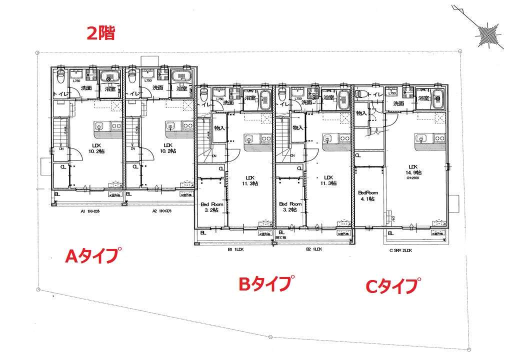 | B | ロフト付1K | LDK10.2帖+ロフト4.7帖 | ガレージ幅4.0m×奥行6.9m(最大部分) | ー | シャッター幅2.6m×高さ2.2m | 入居中 | ||
